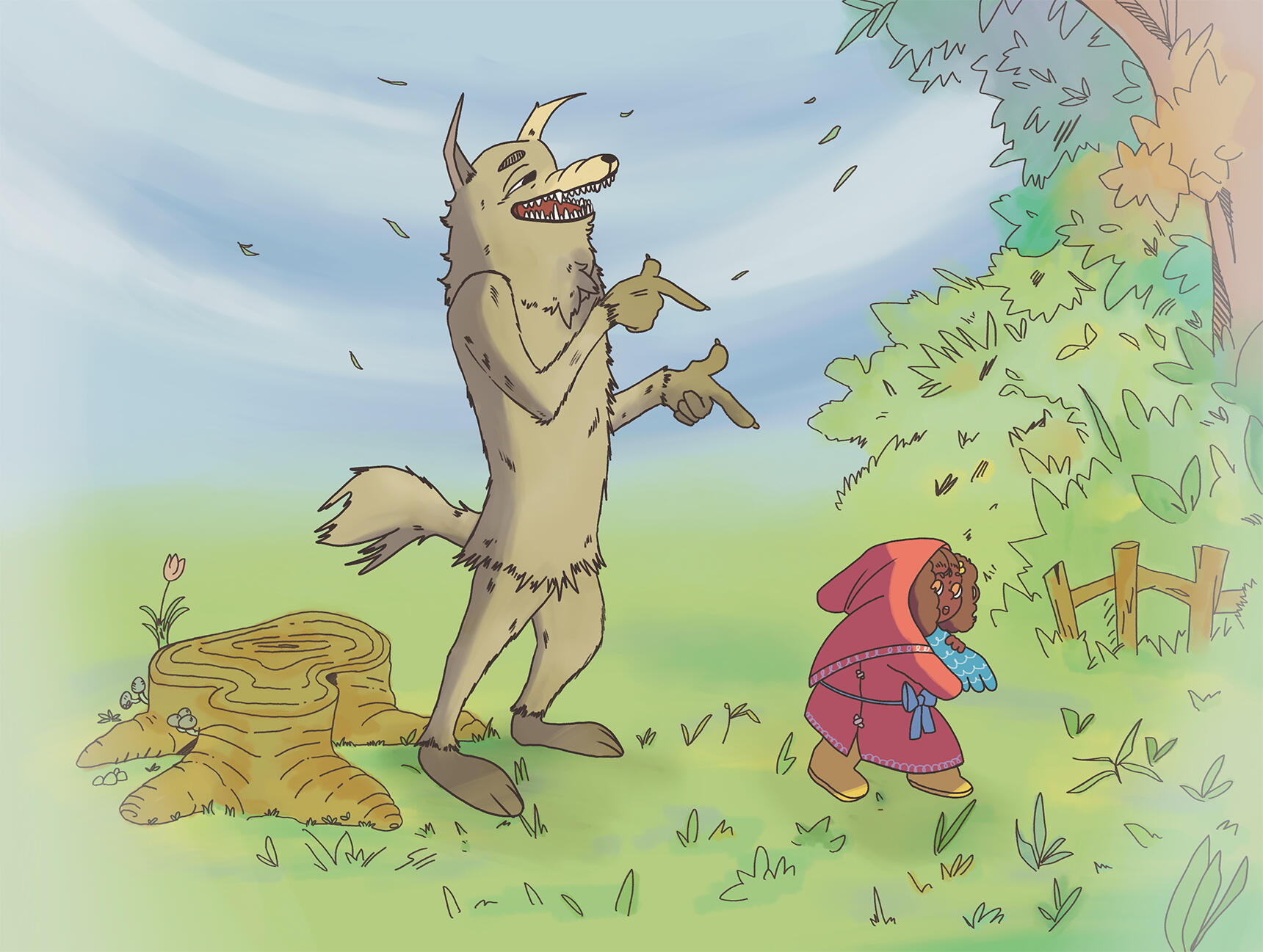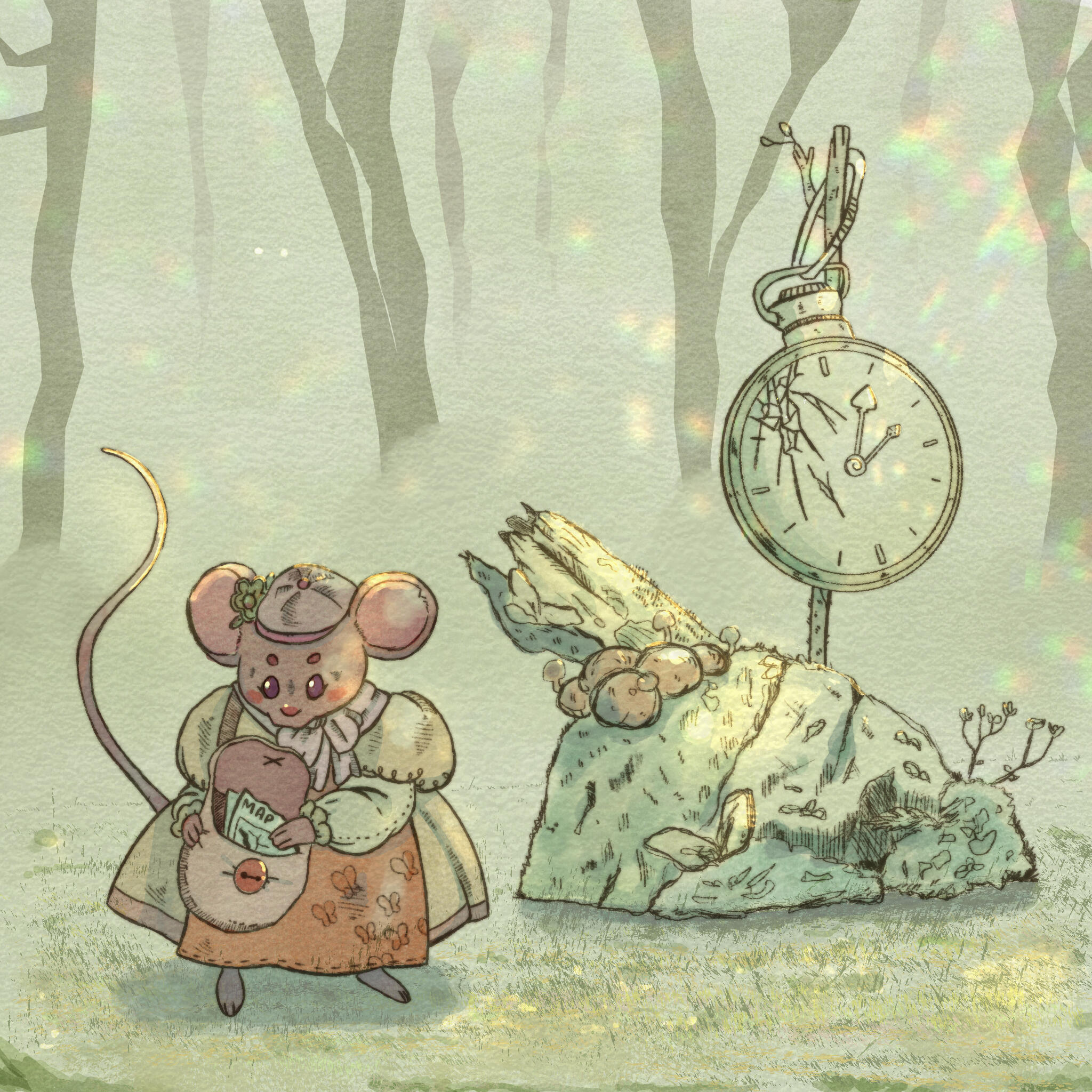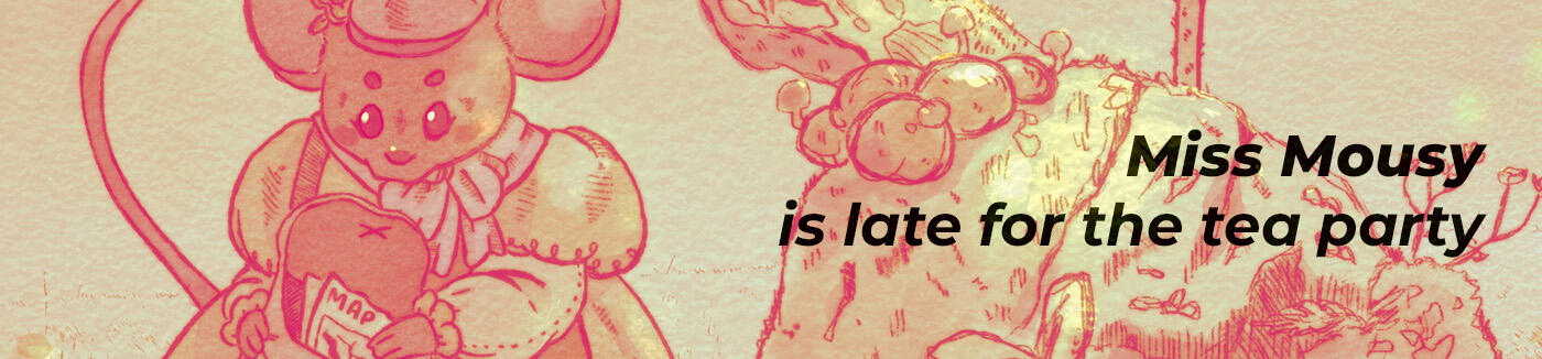 Today, the sounds of the forest nearly drown out the tiny little footsteps of this mouse, who has been invited to lunch at a friend’s house. What was meant to be just a brief walk turns into an adventure for our absent-minded friend. Digital illustration with a clear inspiration: the watercolors of Beatrix Potter.