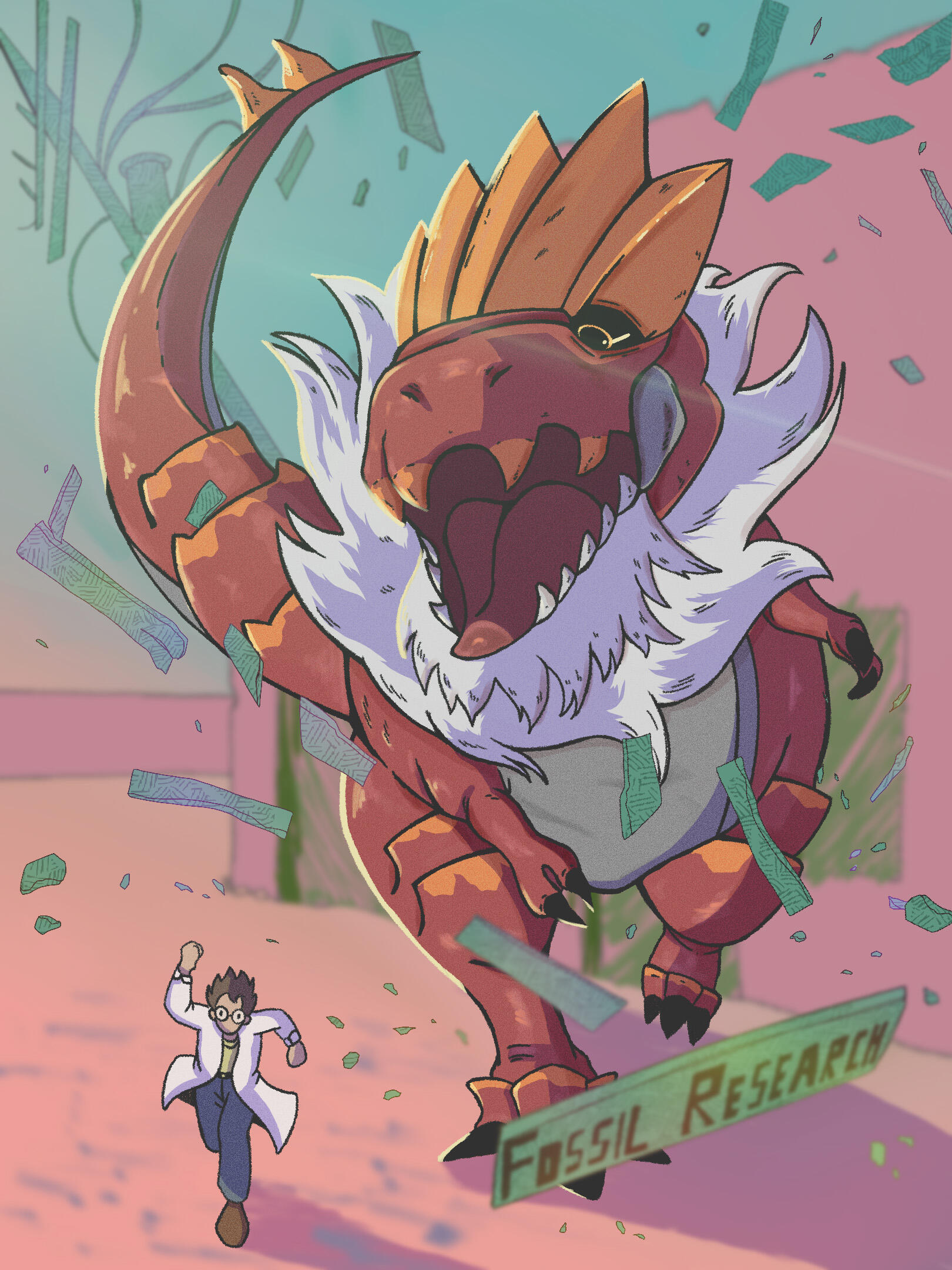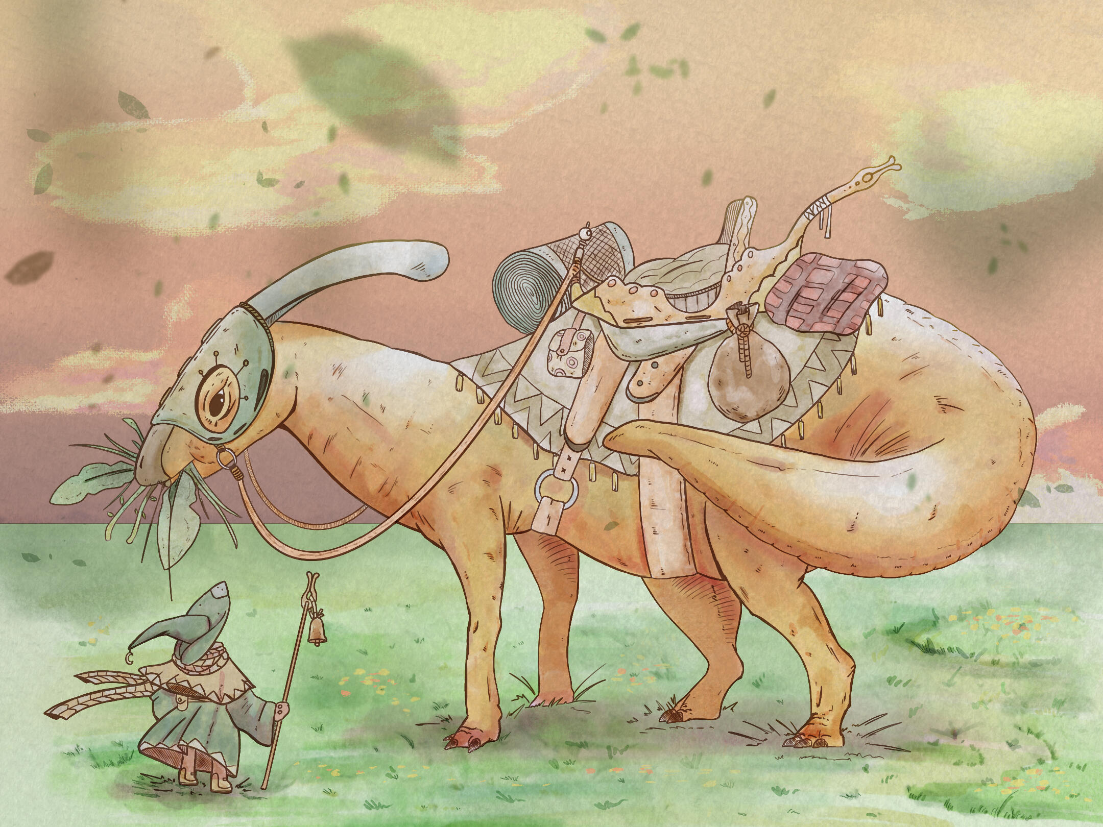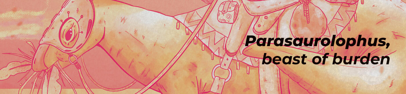What if dinosaurs still walked among humans? In this illustration, one of the coolest dinosaurs (in my humble opinion), the Parasaurolophus, is portrayed as a calm and gentle animal, serving as the ever-faithful beast of burden for the character who accompanies it on long journeys from one corner of the world to another. Carrying loads and deliveries for those in need, the companionship between these two is something to aspire to.