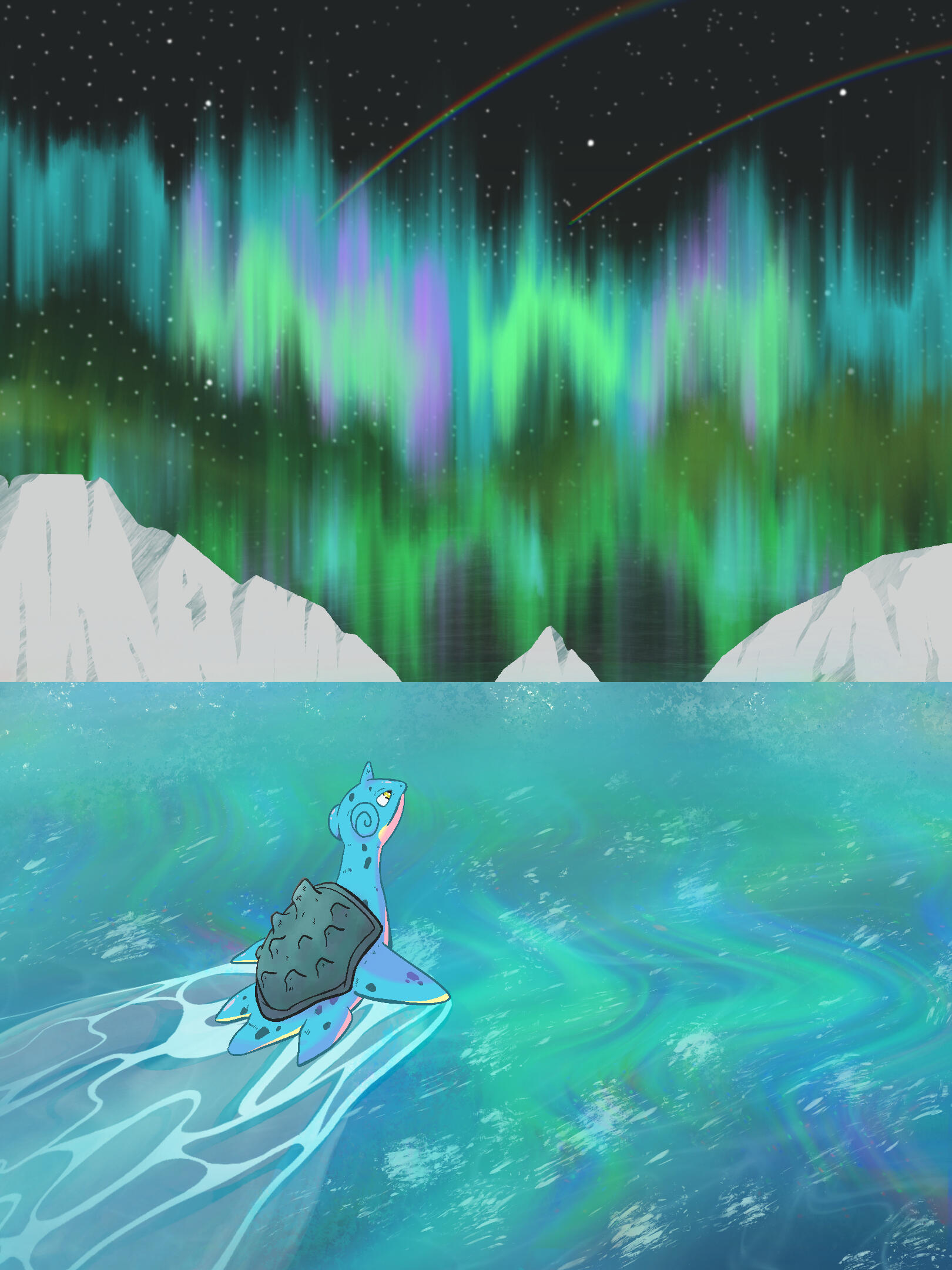 My favorite Pokémon, Lapras. To me, it represents the adventure, sense of wonder and mystery that this series has to offer. From our first encounter on a Friday on Union Cave in Pokémon Silver, I never forgot how excited if made me feel. A rumor from an NPC in the game saying that on Fridays, cries could be heard in the depths of the cave made my child self imagine what kind of creature could lie there.And then, in a Friday after school, I venture deep in the cave to find this majestic creature.