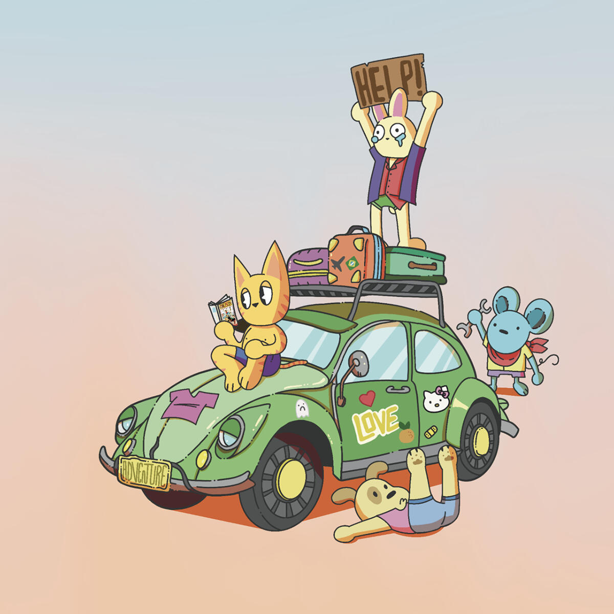 Middle of NOWHERE | By the warnimalsAn album cover for a band of animals, as they debut with songs about roadtrips, adventure, hardships and friendship.