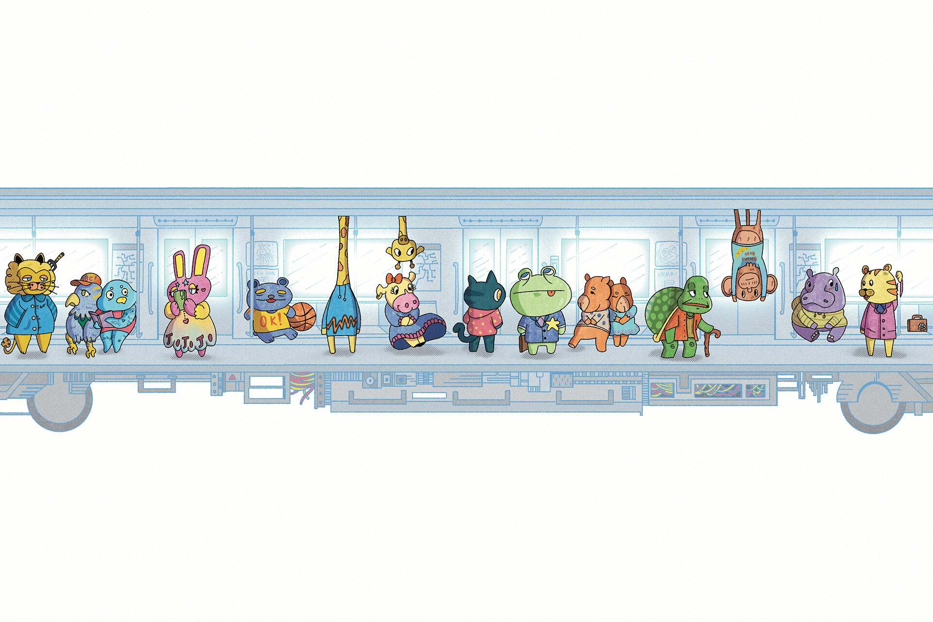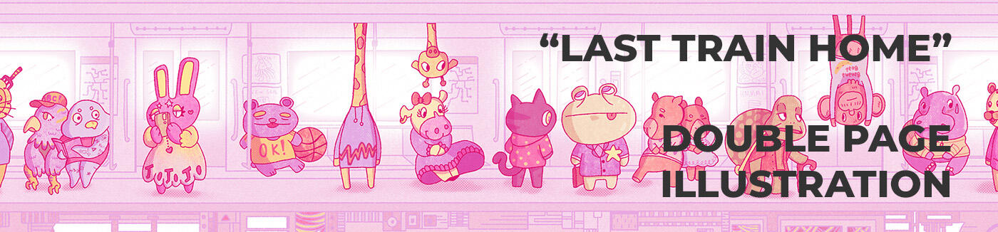 Conceived as a double-page illustration, the goal was to create a contrast between the cuteness of the animals and the mechanical coldness of the wagon they inhabit at this time.