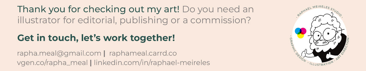 Hi! I’m Raphael, a freelance illustrator and graphic designer from Brazil. I work in illustration, character design, book covers, art for companies, commissions orders for individuals and so much more involving art and graphic design.