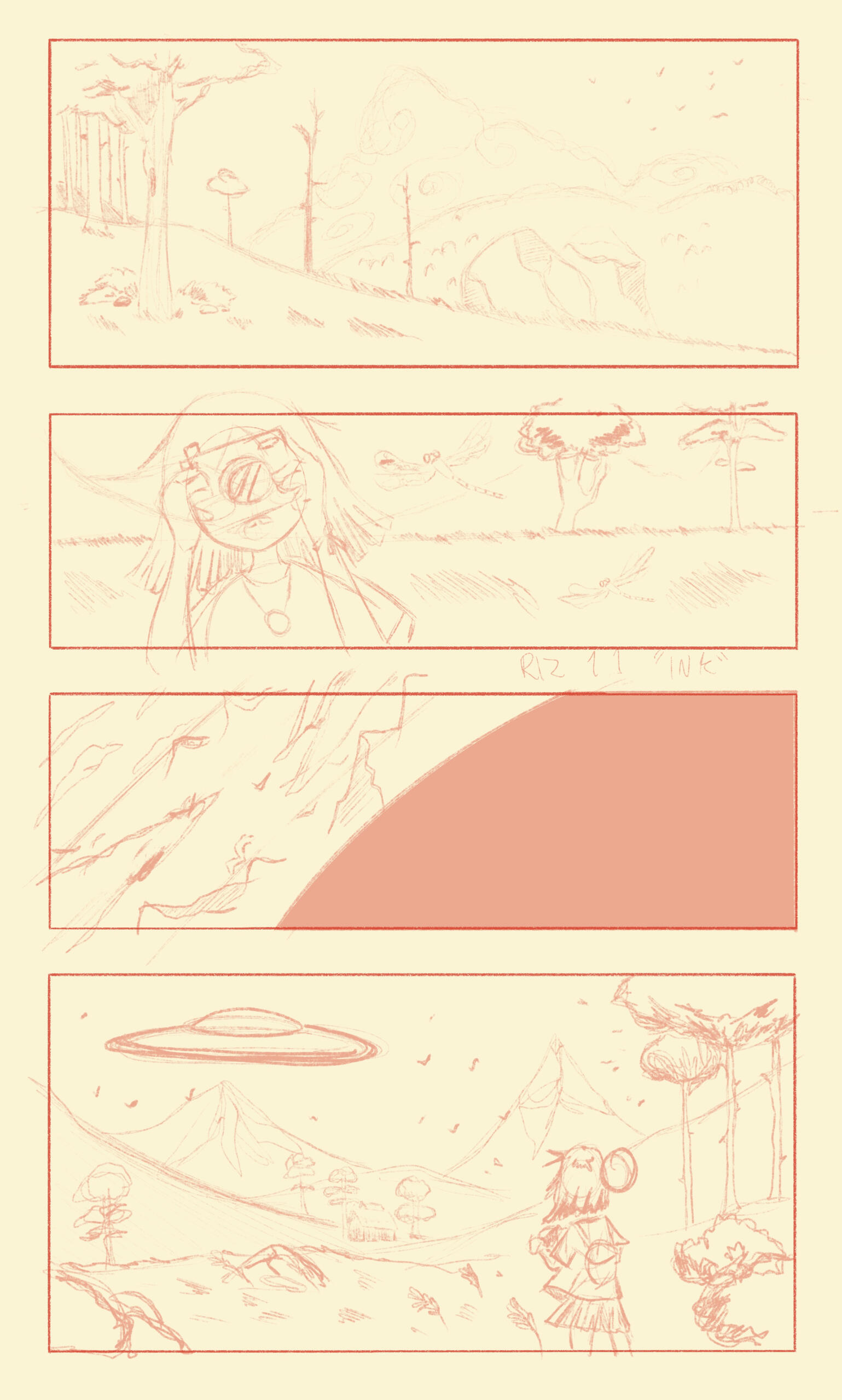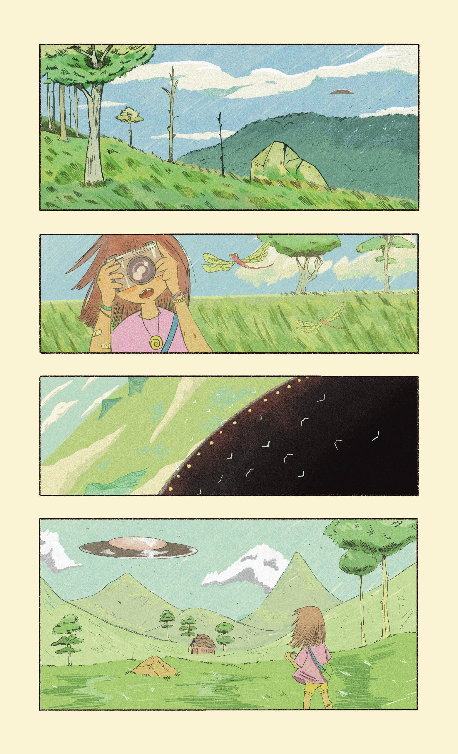 Can a 2D illustration depict wind? With that question in mind, I created 'The Girl and the UFO.' Mostly inspired by how Studio Ghibli portrays the wind, I developed this short story about a young, aspiring nature photographer encountering a UFO.