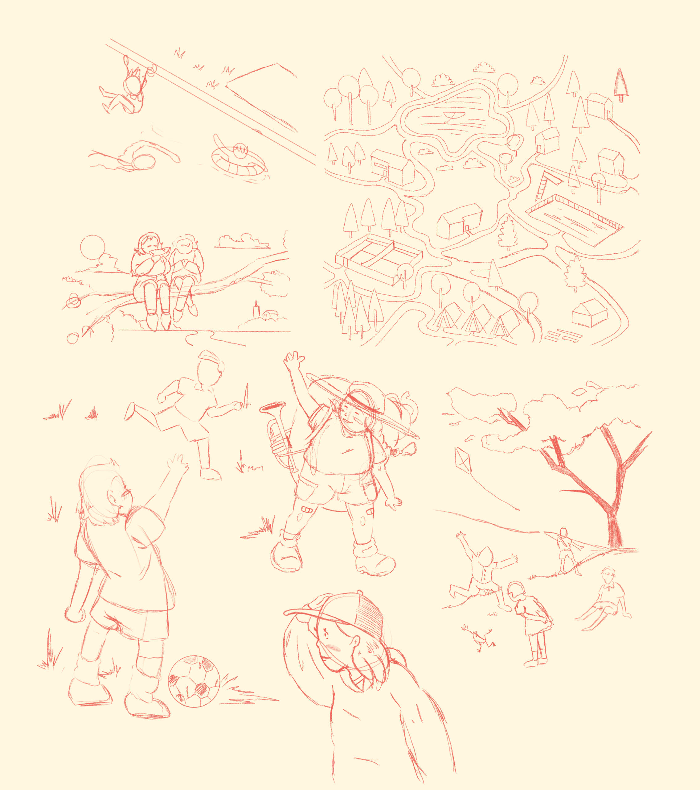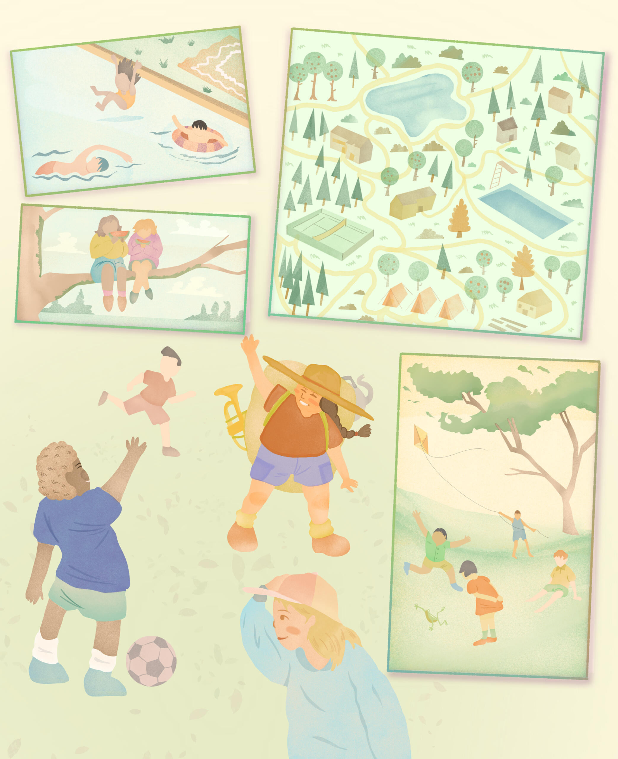 The main goal of this illustration was to depict the concept of memories that children will acquire by participating in the summer camp. To achieve this, I played around with the concept of a scrapbook that a child might create to keep photos of their time at the camp.