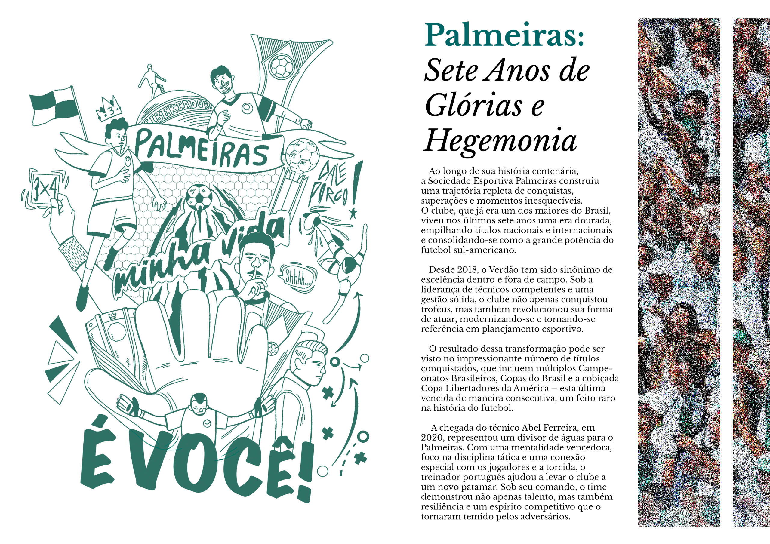 Over the past seven years, Sociedade Esportiva Palmeiras has built an era of dominance, collecting national and international titles and solidifying itself as one of the greatest football clubs in South America. This series of illustrations captures the essence of Palmeiras' recent golden age.Explore the journey. Relive the triumphs. Feel the glory.