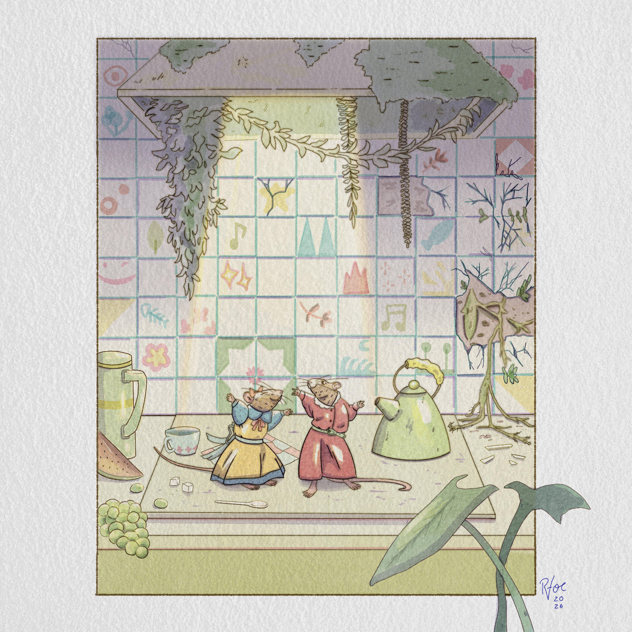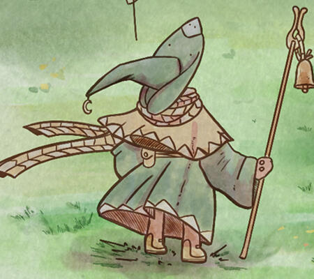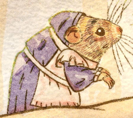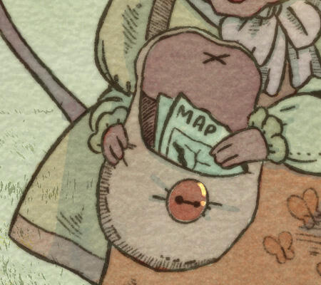 Today, the sounds of the forest nearly drown out the tiny little footsteps of this mouse, who has been invited to lunch at a friend’s house. What was meant to be just a brief walk turns into an adventure for our absent-minded friend. Digital illustration with a clear inspiration: the watercolors of Beatrix Potter.