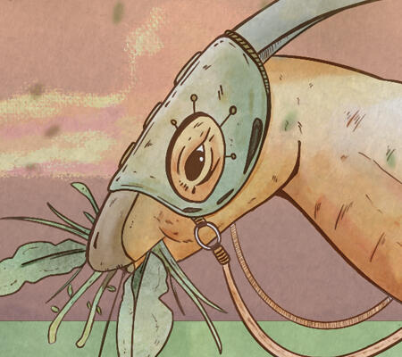Conceived as a double-page illustration, the goal was to create a contrast between the cuteness of the animals and the mechanical coldness of the wagon they inhabit at this time.
