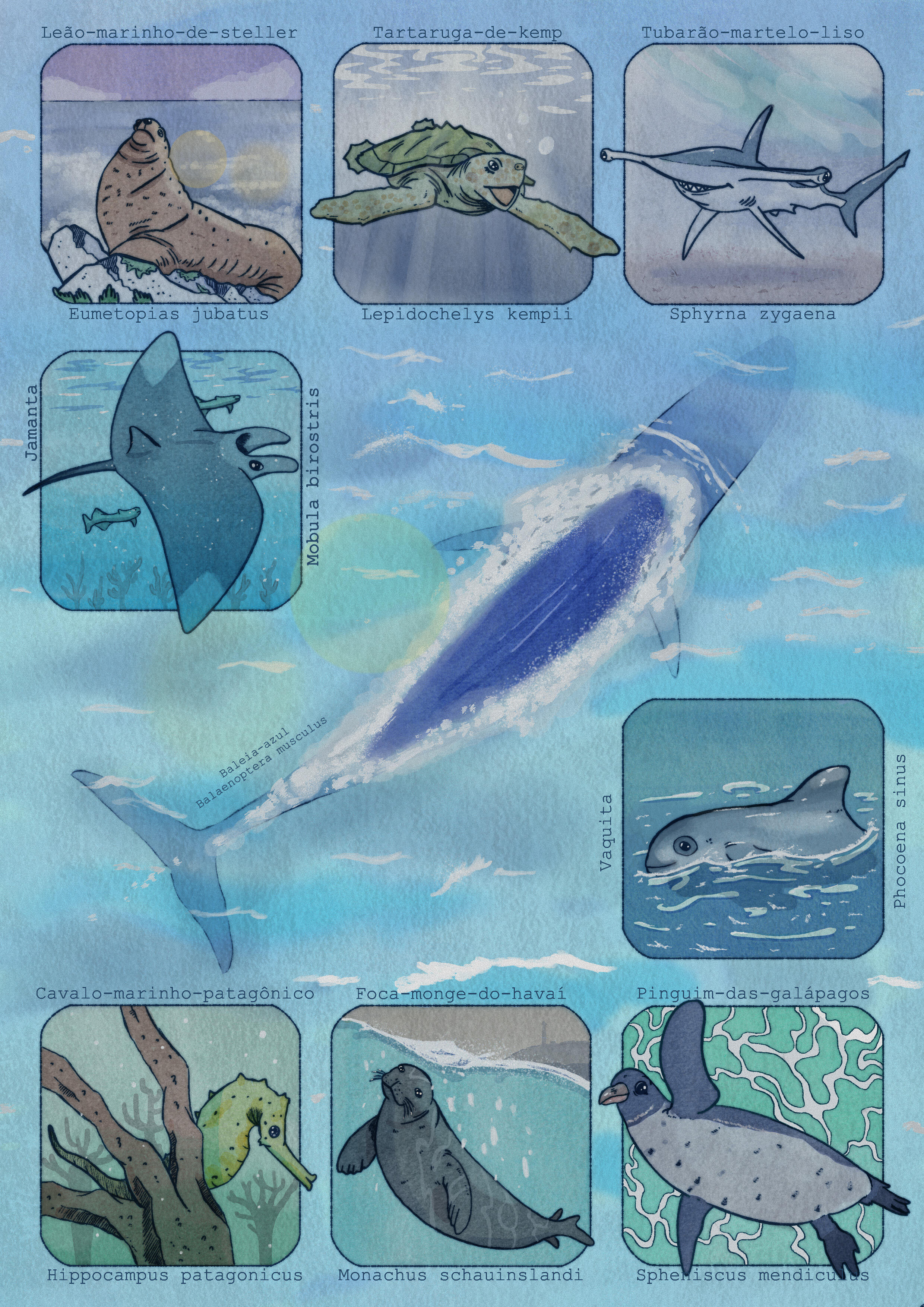 Illustration created for my friends at Centro Lúdica. The idea was to portray some marine animals that are endangered, so that, in addition to decorating the space, the piece can also serve as a theme for ecological awareness for the kids. The artwork will decorate the Under the Sea Room, one of the themed rooms in the children’s therapy space. I am deeply grateful for the opportunity to be part of such a special moment, the opening of Lúdica, and to be able to leave my art there as well.